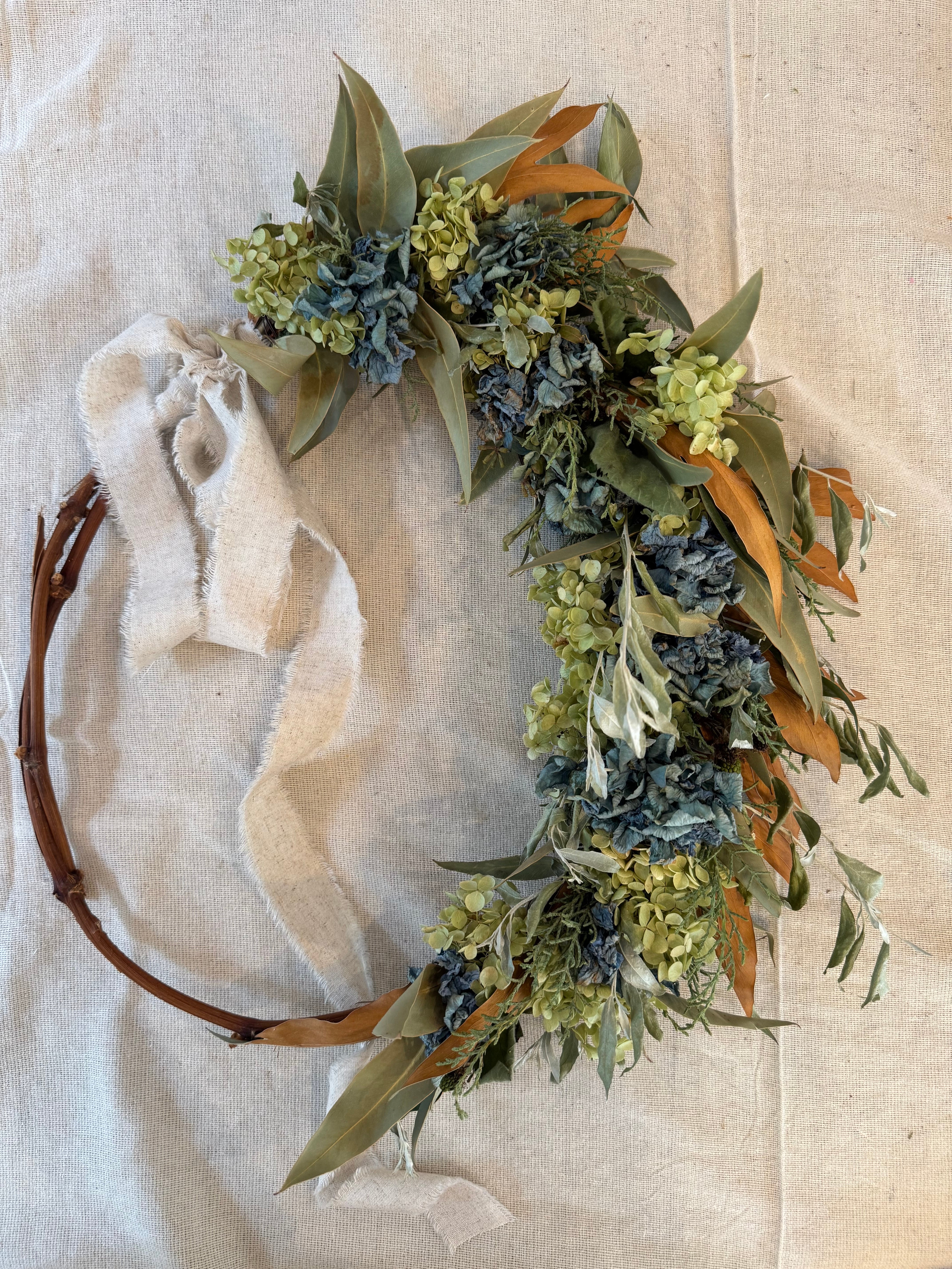 ドライフラワーのアジサイとグレビレアのハーフリース。 アジサイ、アナベル、グレビレア、ブラックベリー、ロシアンオリーブ サイズφ約40センチ ご注文いただいてから1週間以内にお届けさせて頂きます。