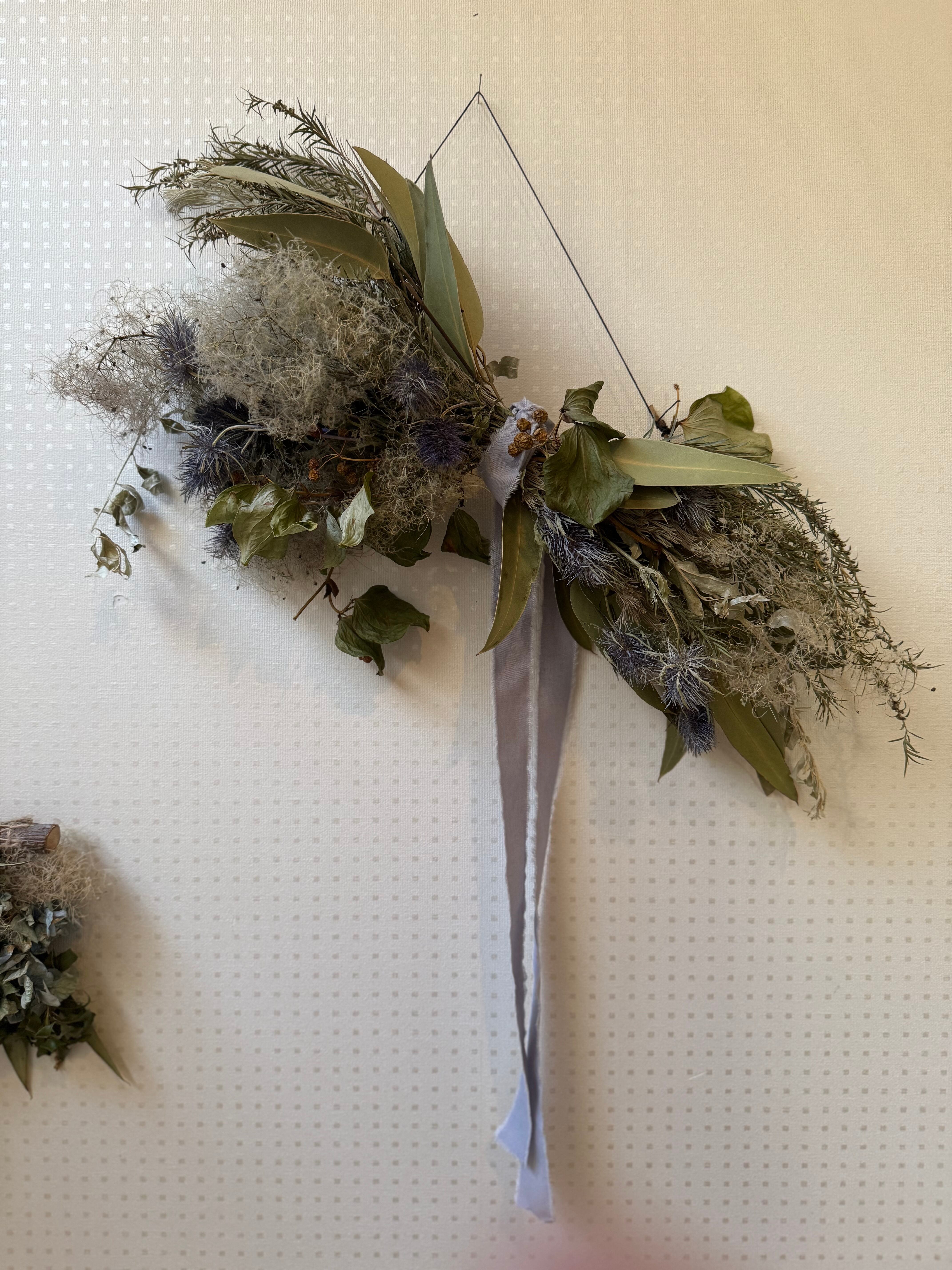 スモークツリーの壁飾り サイズw約55センチ スモークツリー、ユーカリ、サンキライ、ウーリーブッシュなど ご注文いただいてから1週間以内にお届けさせて頂きます。