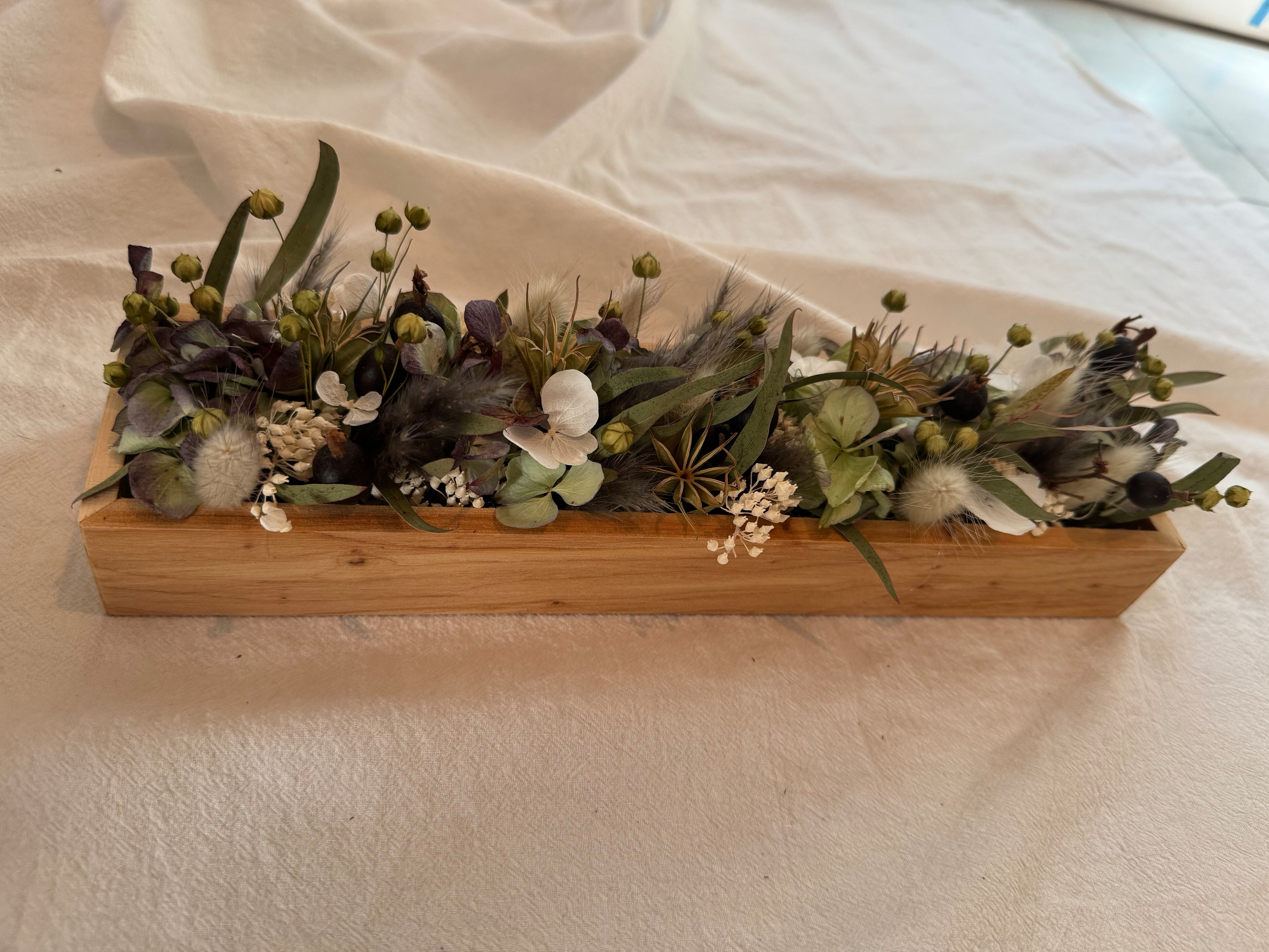 アジサイ、ユーカリ、ラグラス、ブラックベリードライフラワーなどを使用した箱花です。