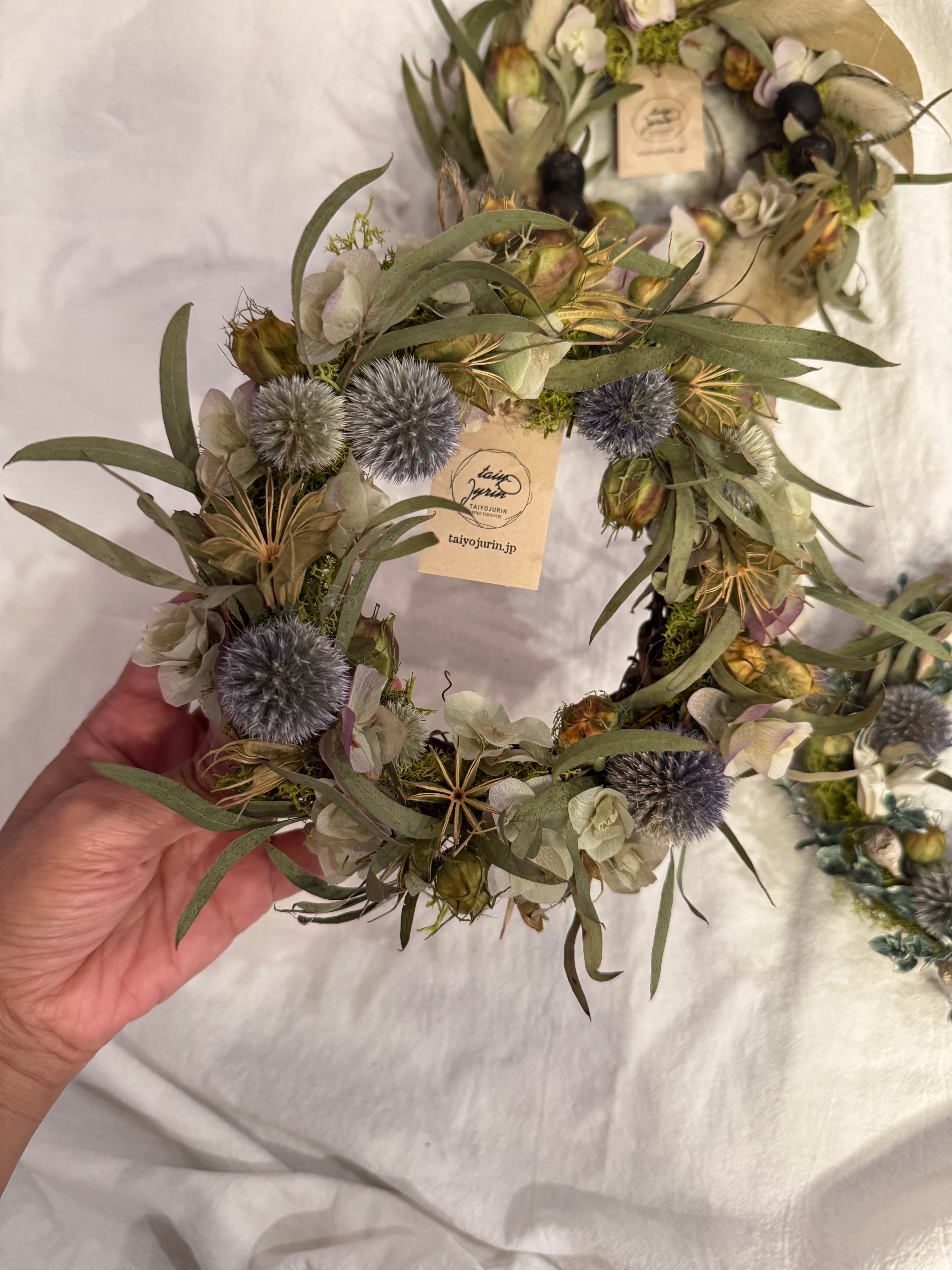 ドライフラワーの小ぶりでナチュラルなリース 二枚めの画像左下 ルリ玉アザミ、オレガノケントビューティ、ニゲラオリエンタリス、モス、ユーカリ サイズφ約20センチ ご注文いただいてから1週間以内にお届けさせて頂きます。