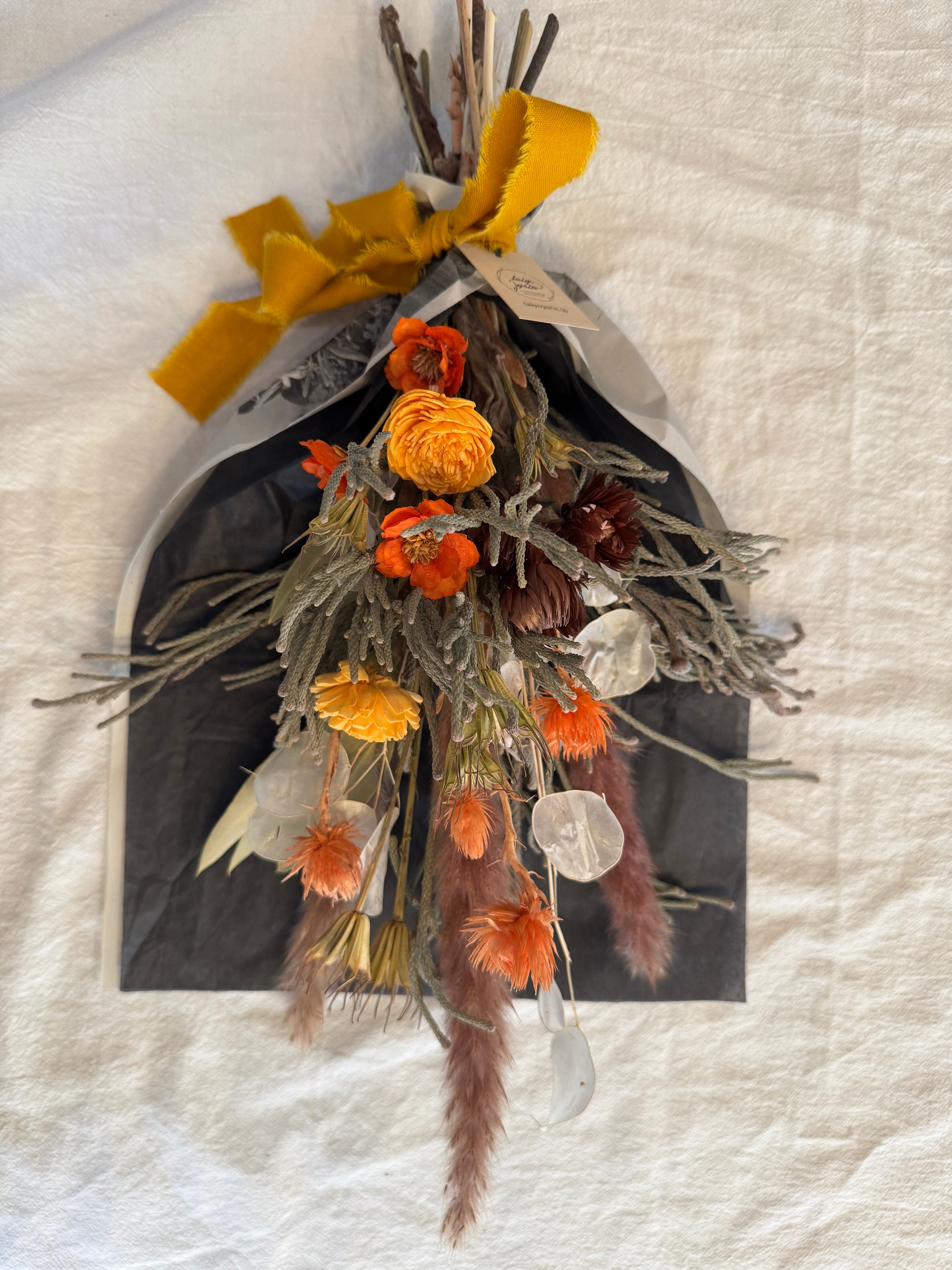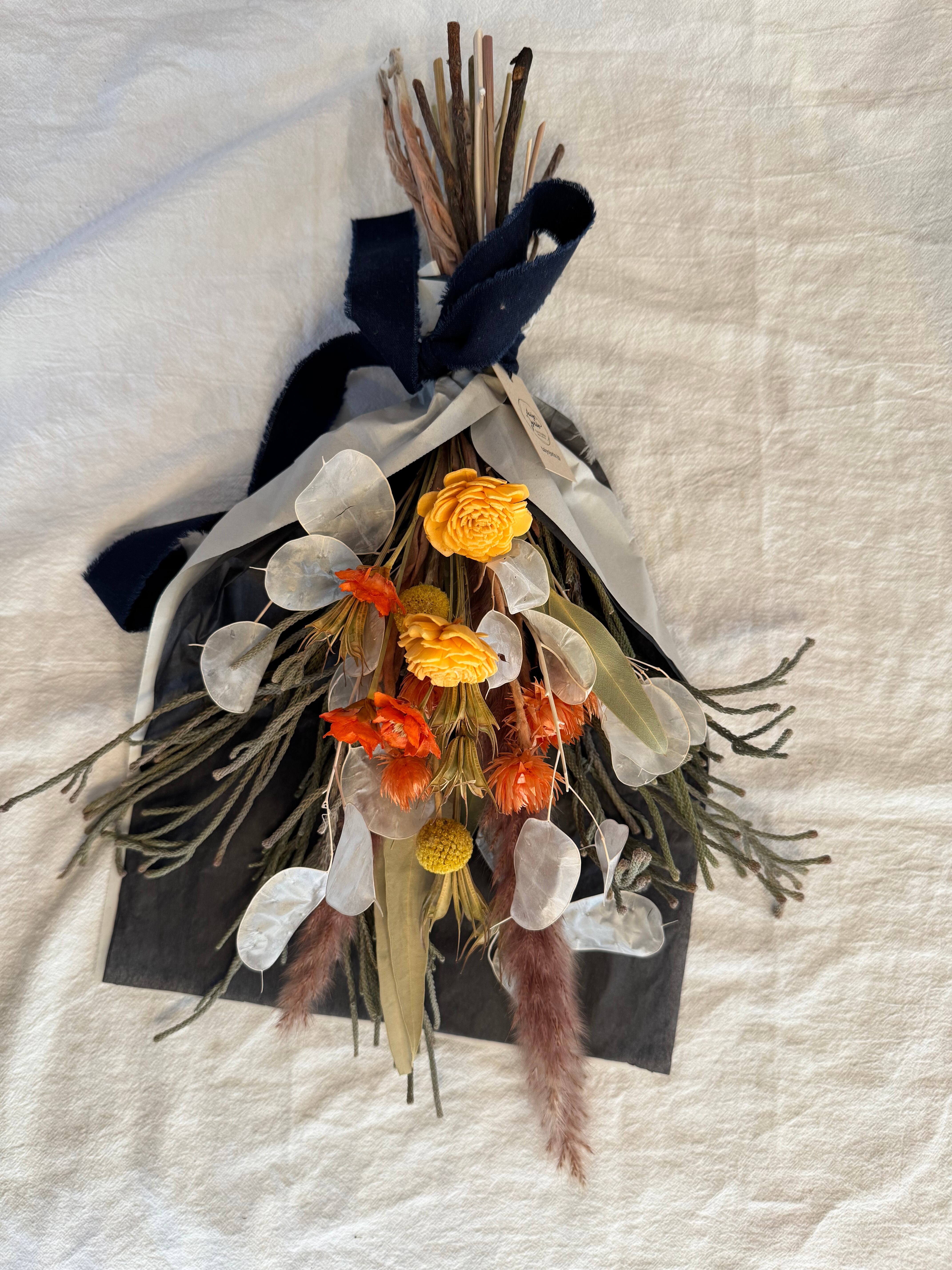 オレンジのソラローズやルナリア、テールリードユーなどを束ねたスワッグ。 サイズh約40センチ ソラローズ、ルナリア、テールリード、ユーカリ、ブルニアなど ご注文いただいてから1週間以内にお届けさせて頂きます。