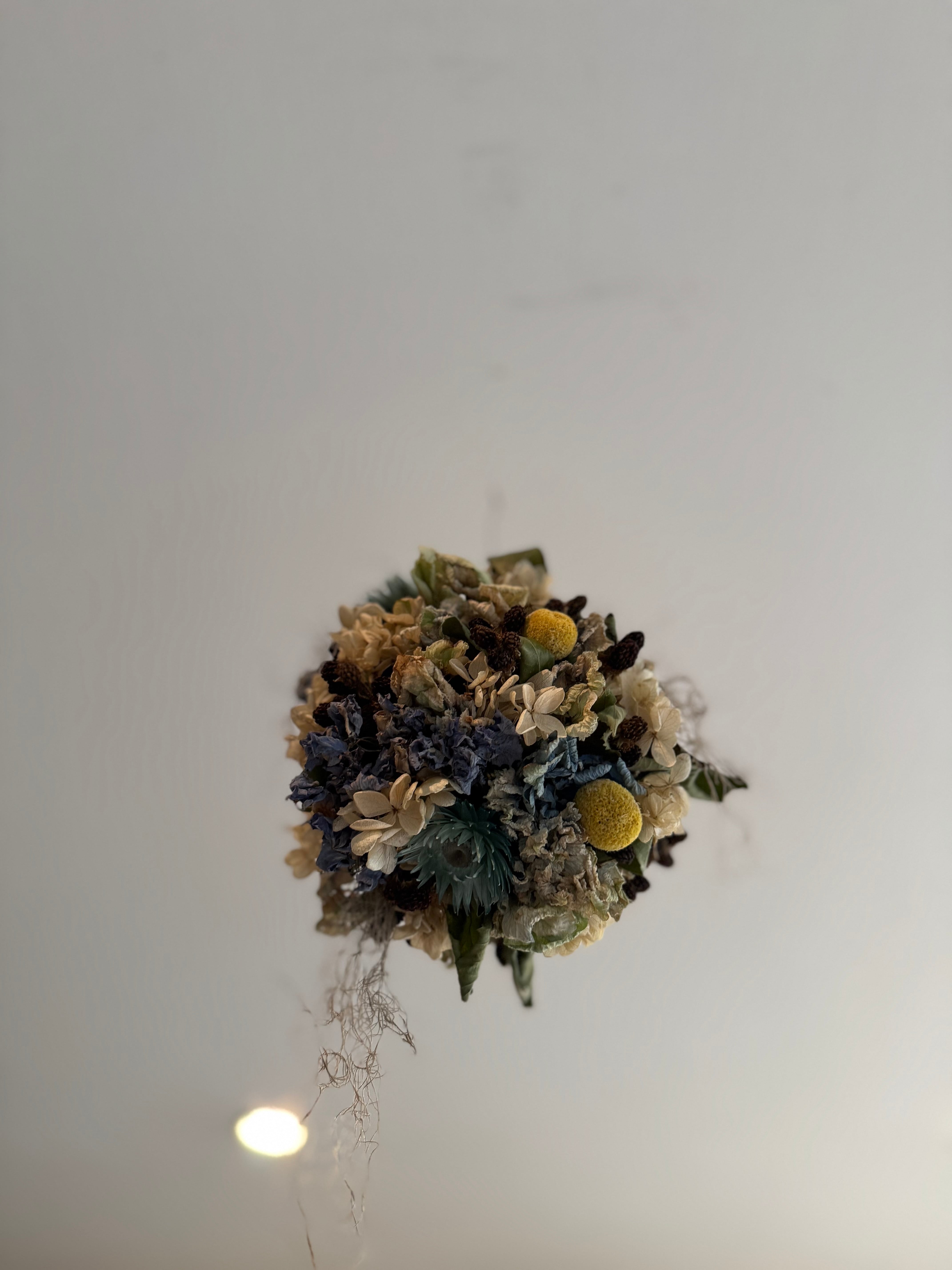 ブラックベリーやアジサイ、グラスペディアなどのシックな色合いのボール。 サイズφ約17センチ ブラックベリー、アジサイ、グラスペディア、スパニッシュモスなど ご注文いただいてから1週間以内にお届けさせて頂きます。