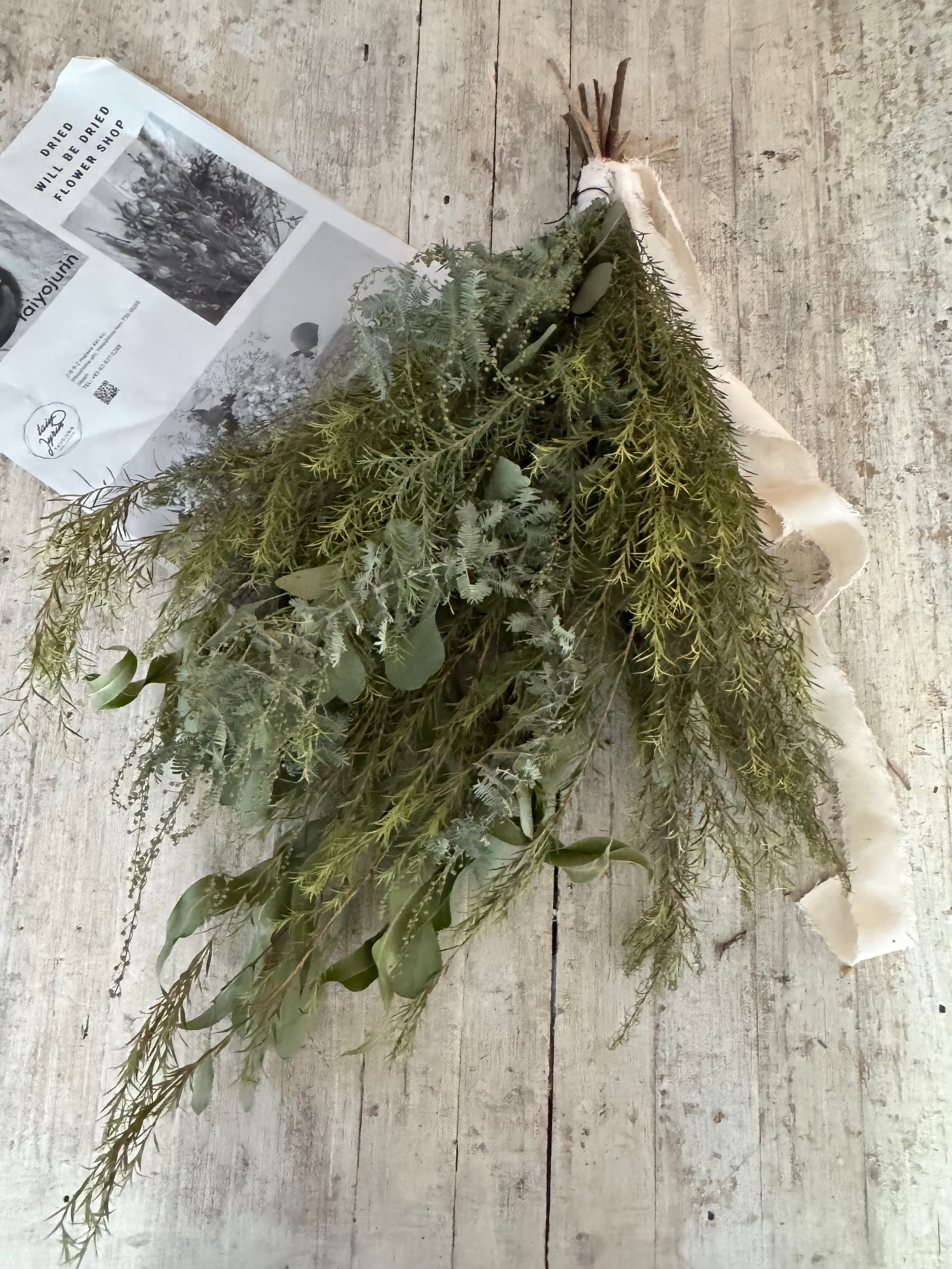 高知市のハーブ専門無農薬栽培農家まるふく農園さんのハーブを存分に束ねました。 爽やかな緑と香りをお楽しみください。 使用花材 ティーツリー、ユーカリ、アカシア他 サイズ 長さ約60センチ ご注文いただいてから1週間以内にお届けさせて頂きます。