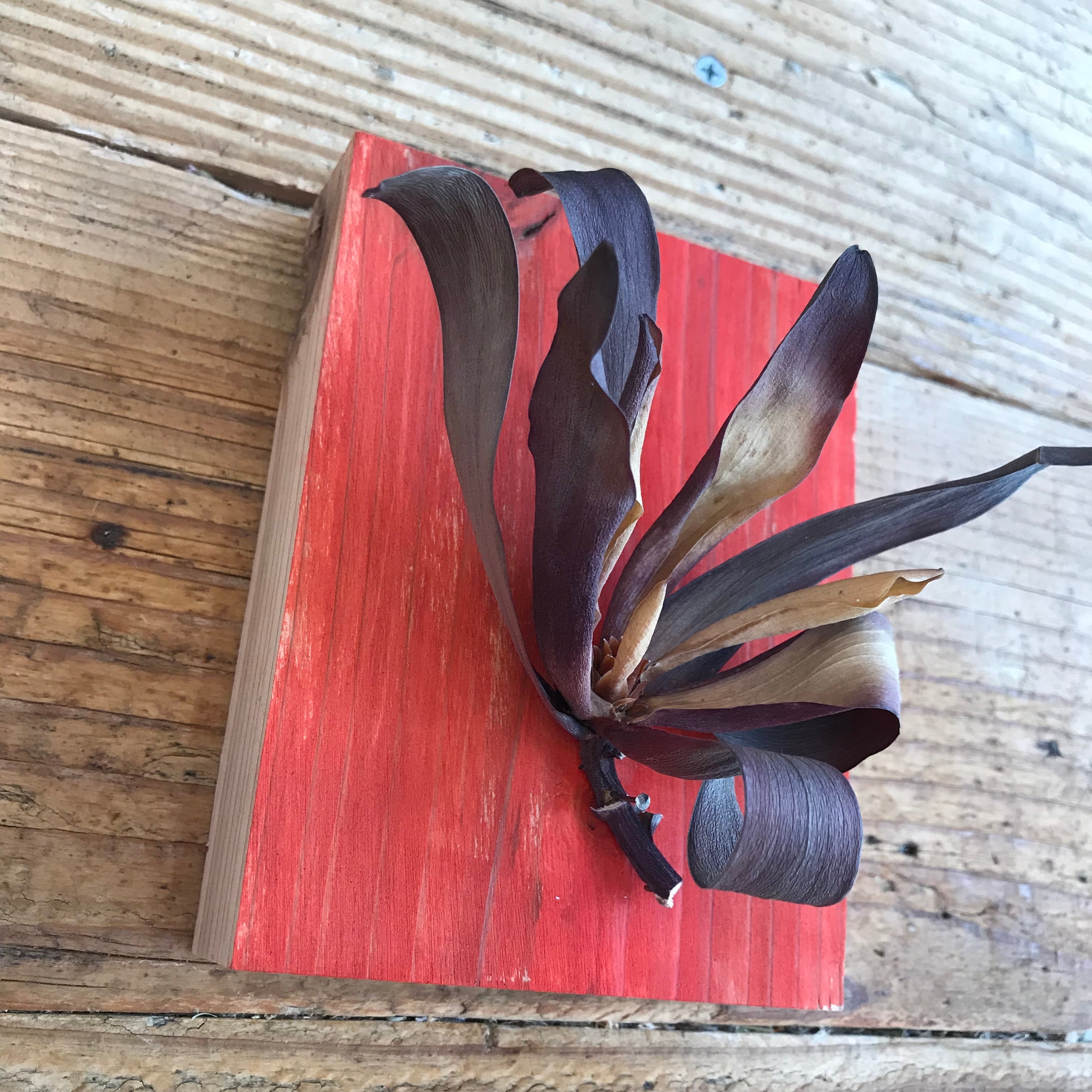 ドライフラワーのレウカデンドロを板にあしらった植物標本です。 小さいながらもインパクトのあるインテリアフラワーです。 サイズ 13.3×10.4×3センチ