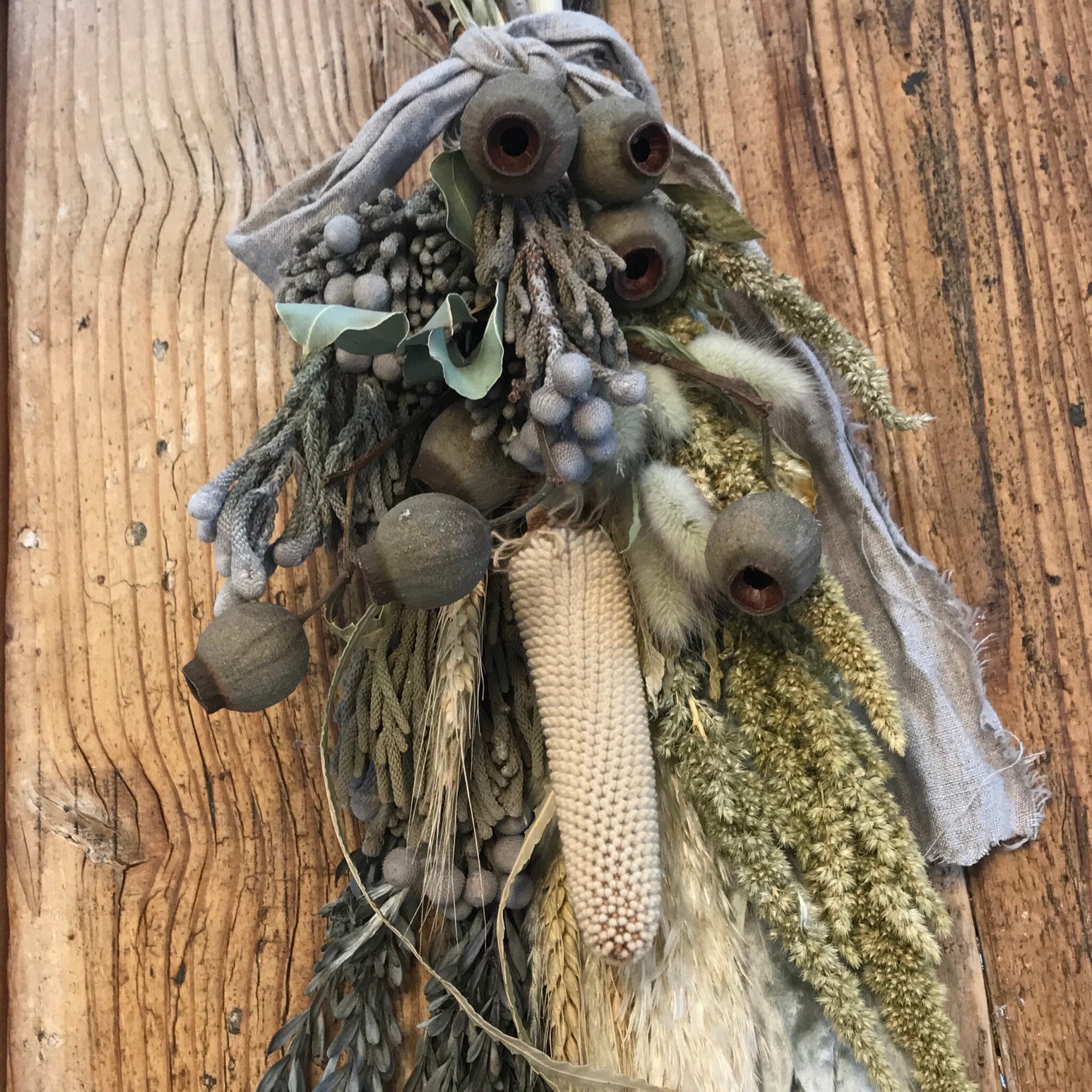 パンパスグラスとグレイッシュな植物で細長いスワッグに仕上げました。