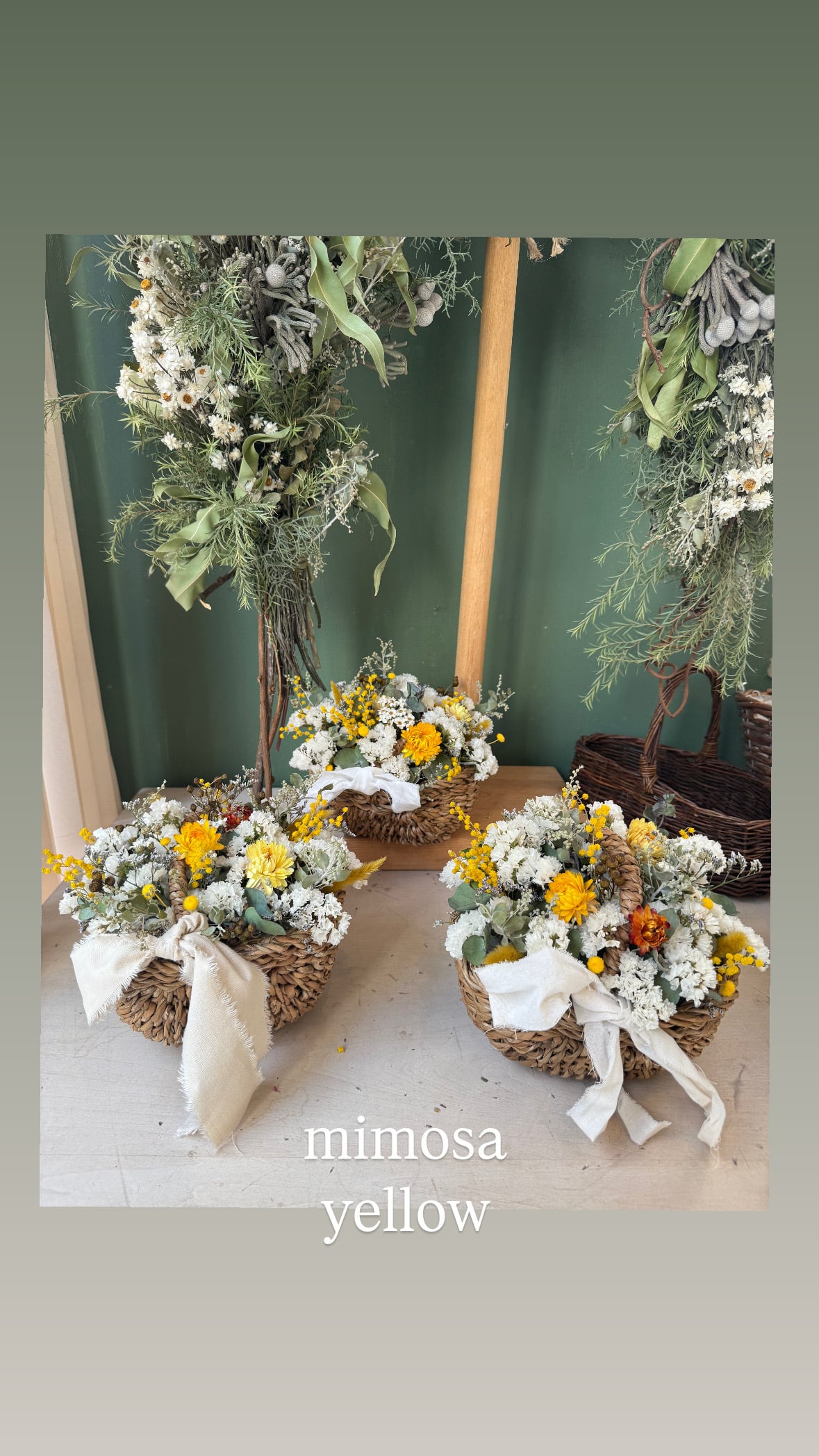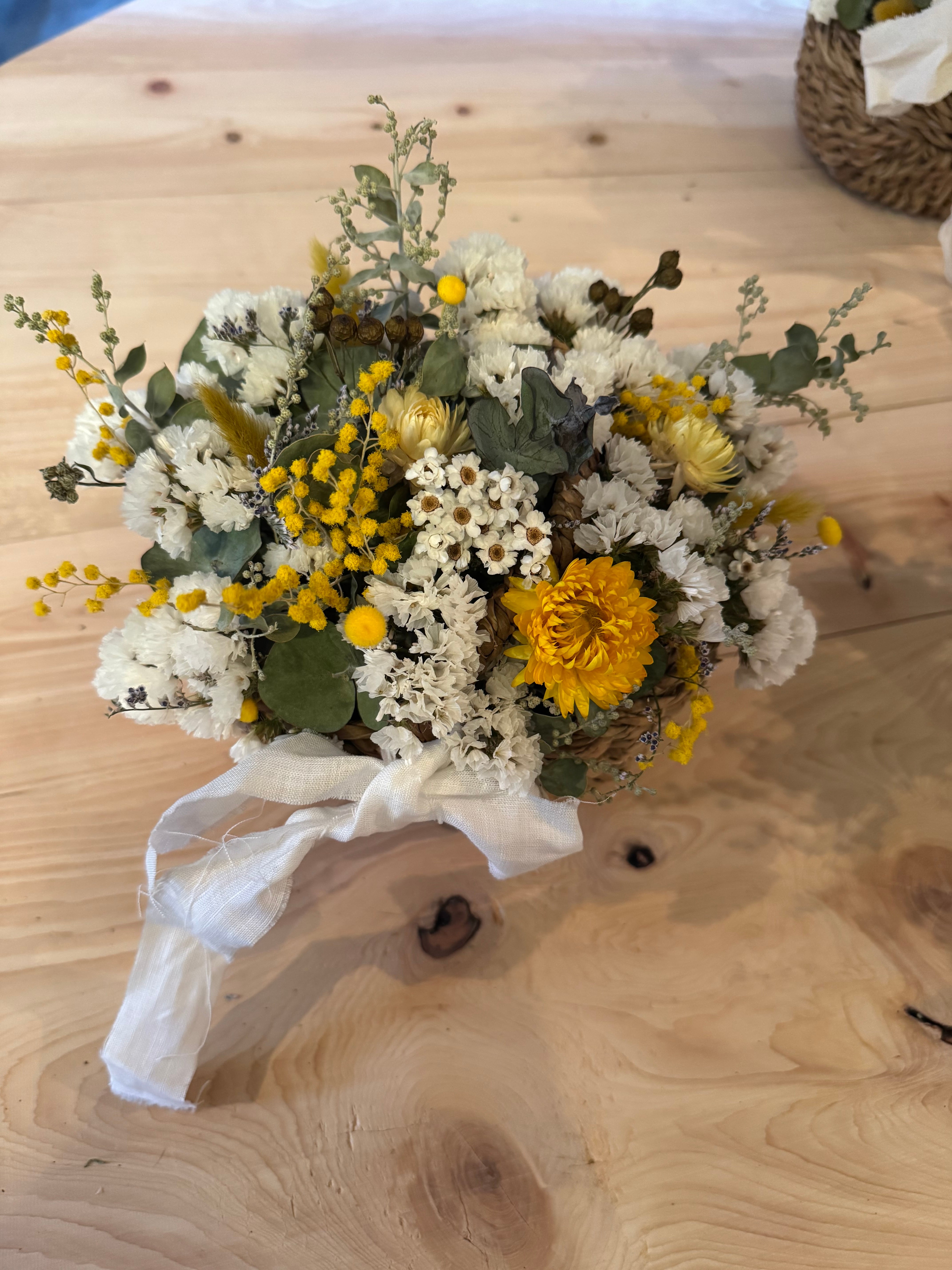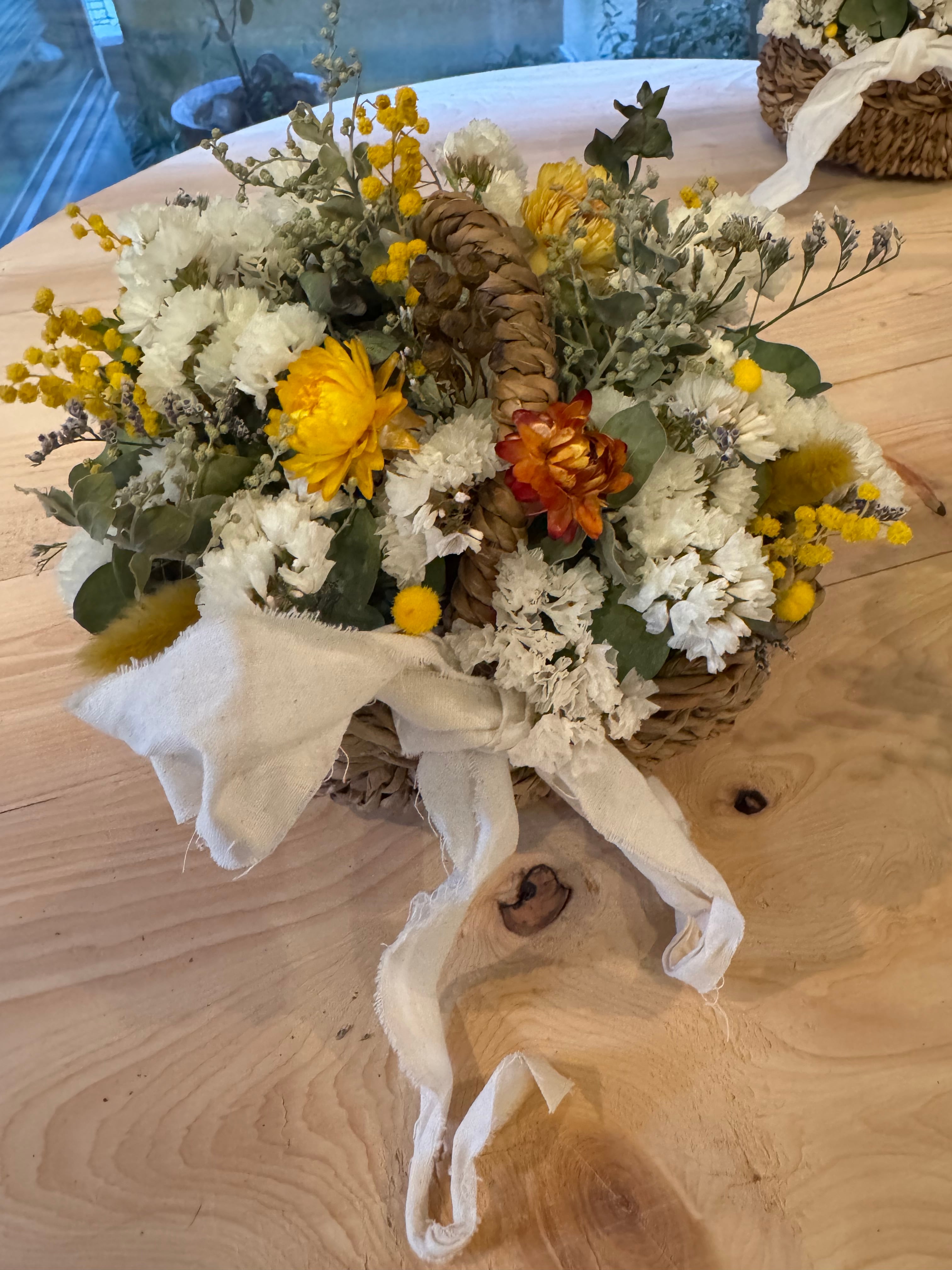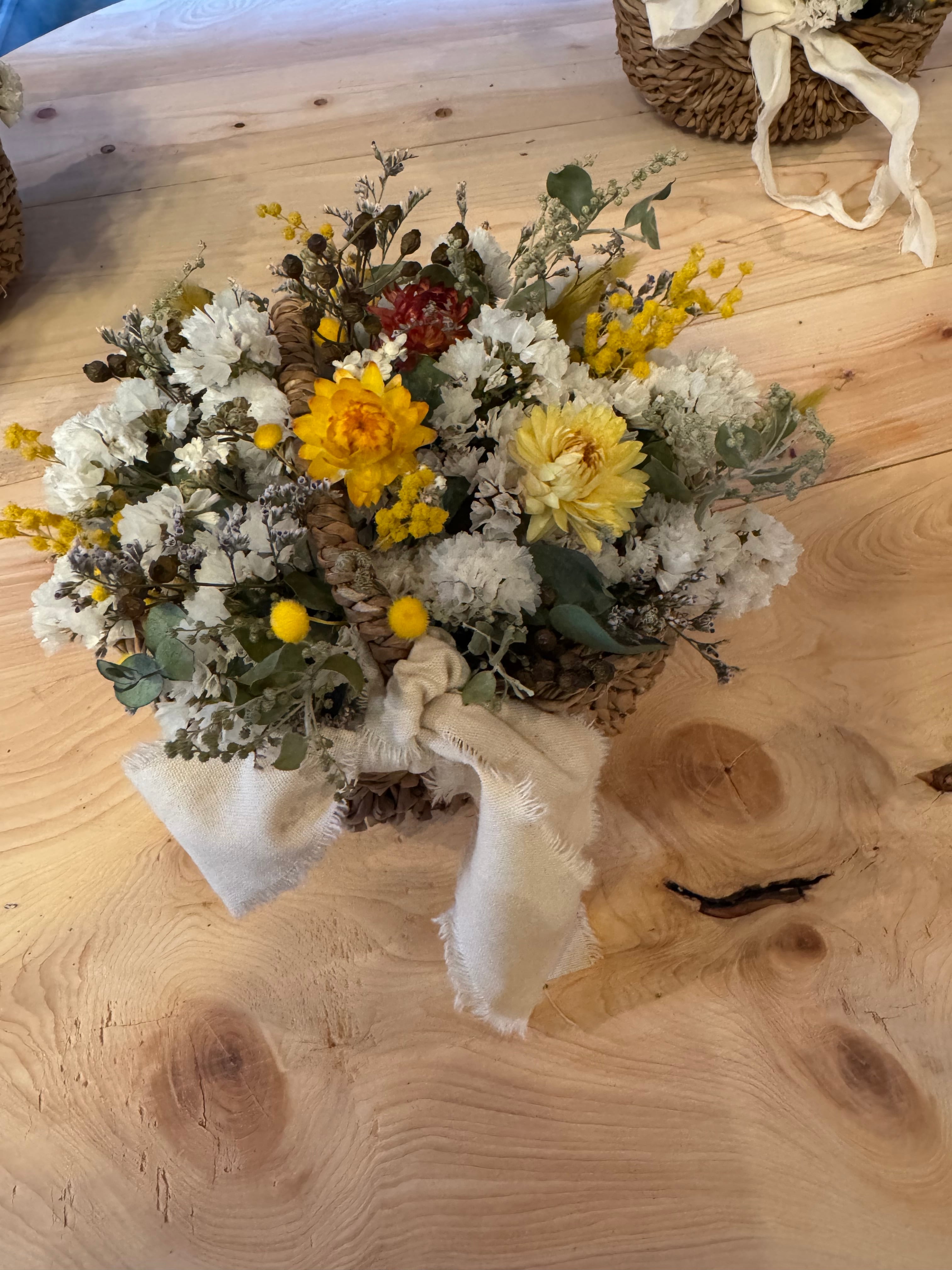 ミモザ、スターチス、ヘリクリサムやユーカリなどのドライフラワーを使ったアレンジです。