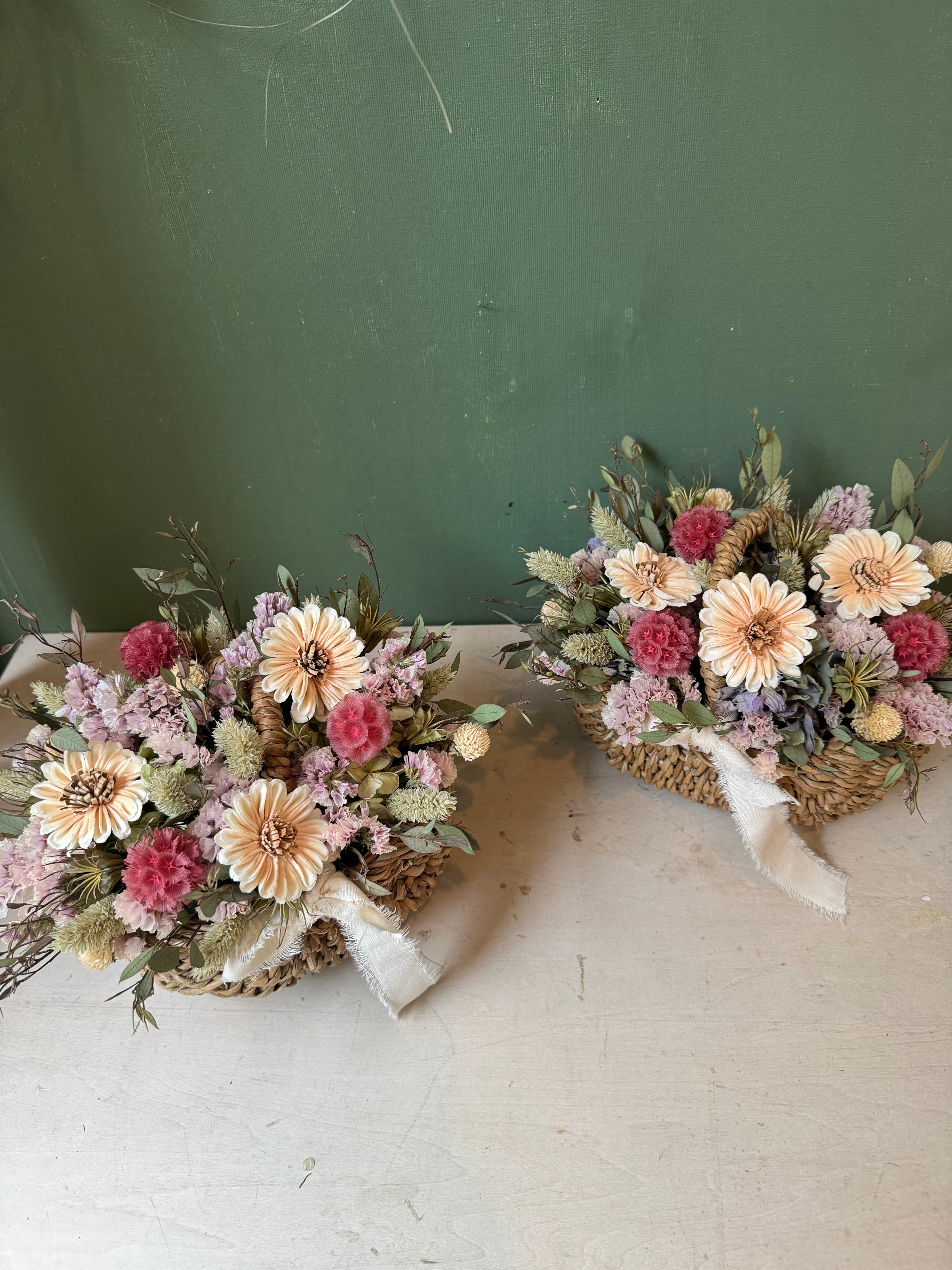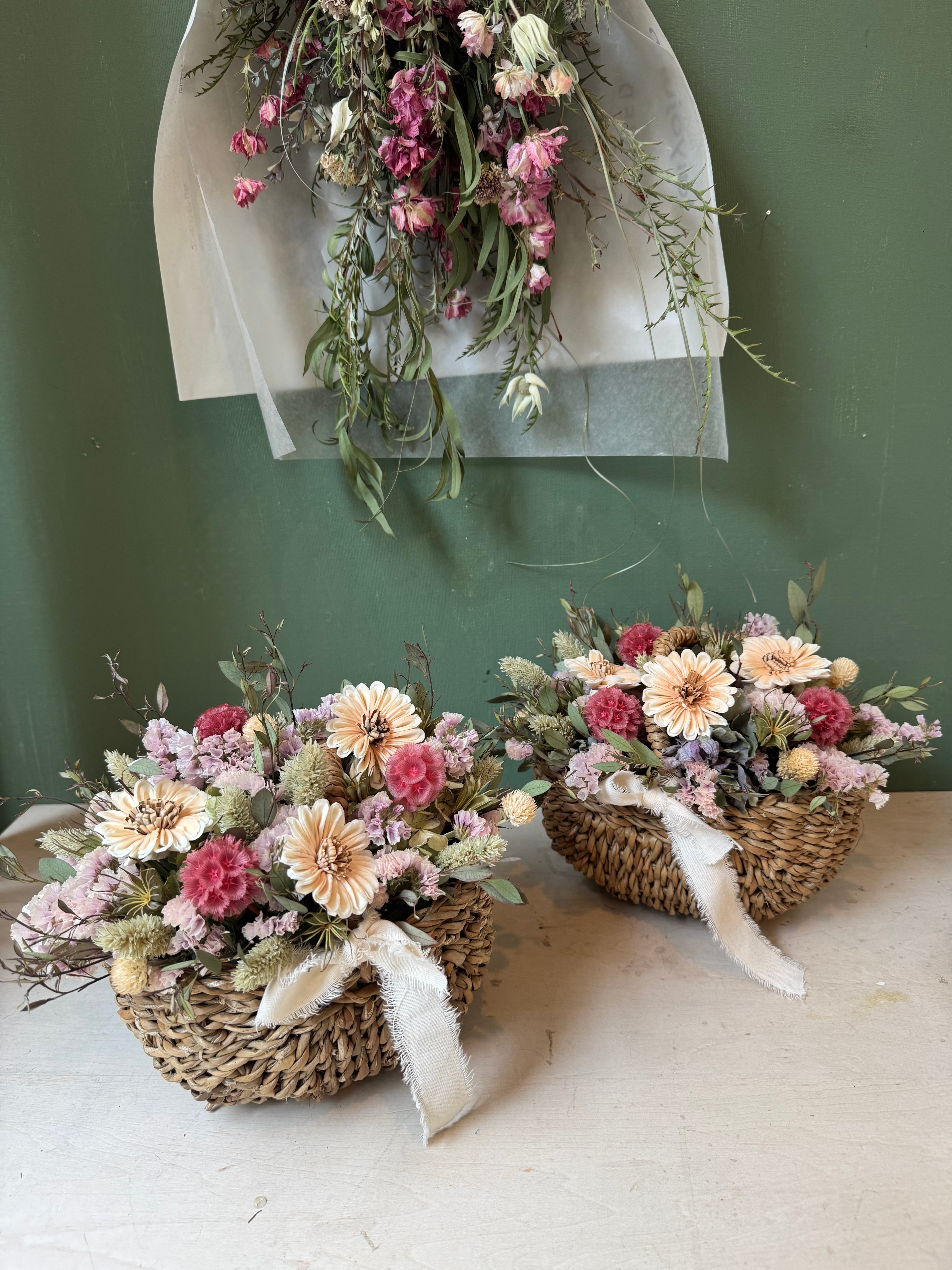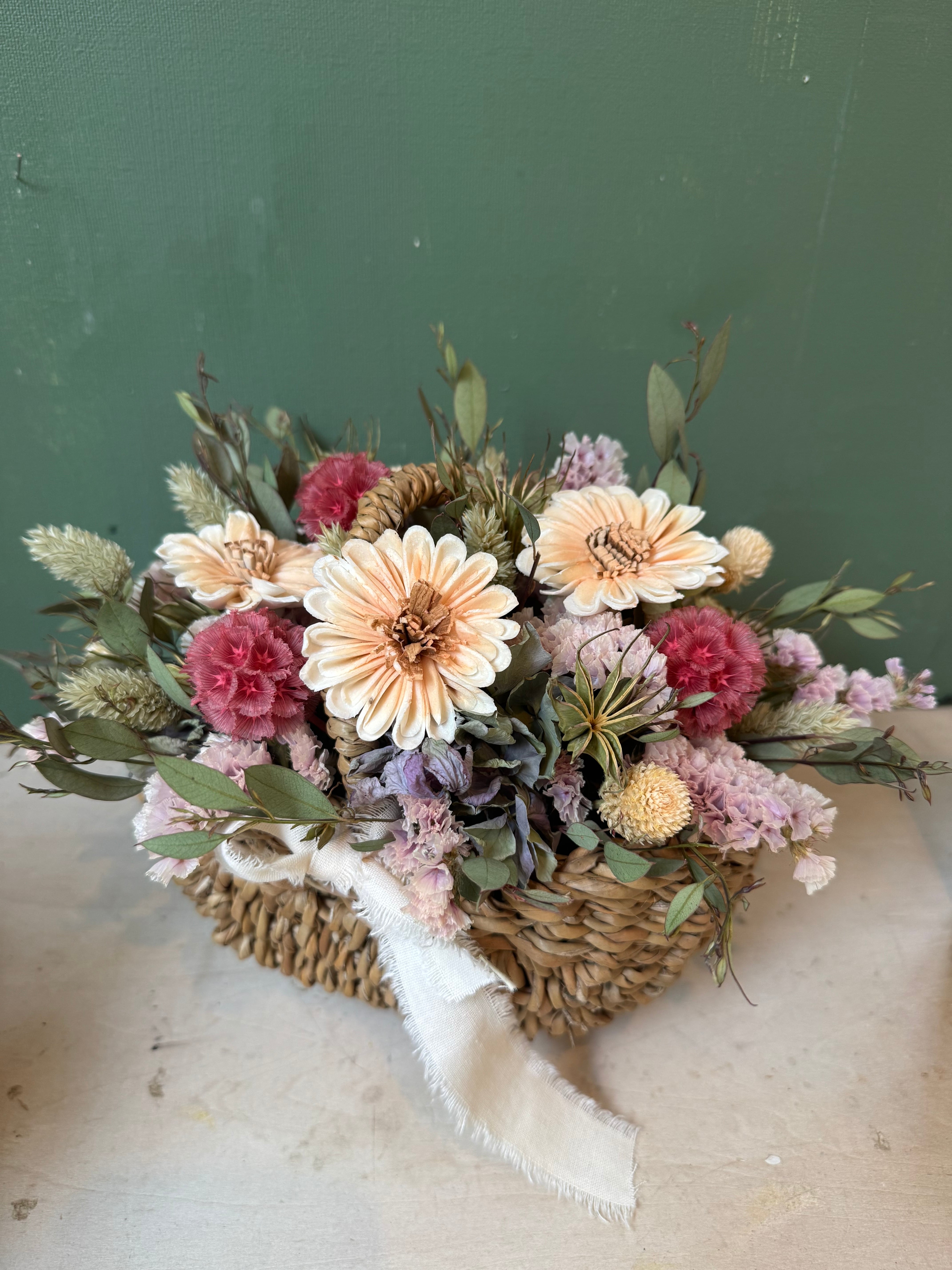 デイジー、スターチス、ステルンクーゲルやユーカリなどのドライフラワーを使ったアレンジです。
