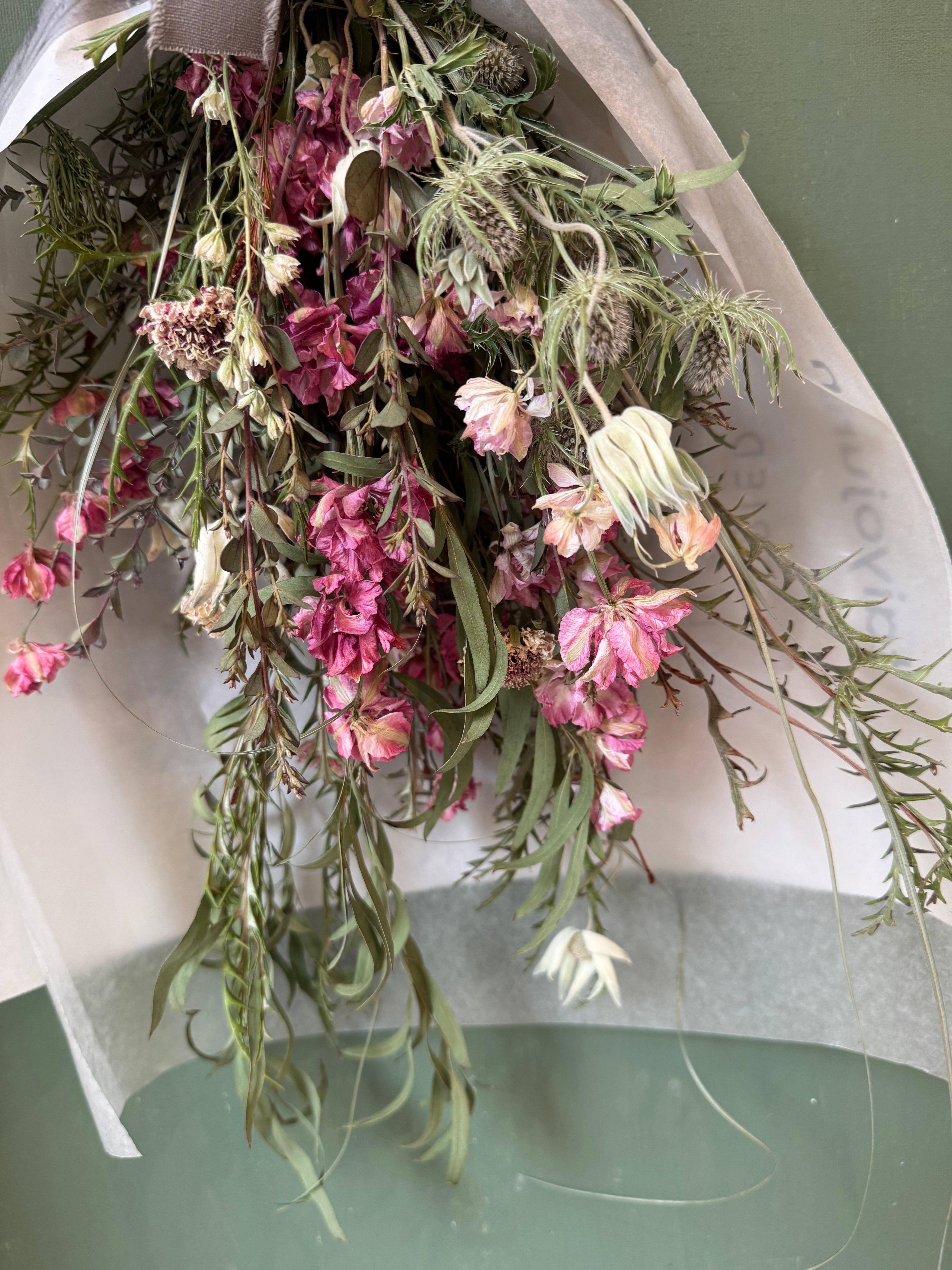 ラクスパー、ユーカリニコリー、スカビオサなどの植物を束ねました。