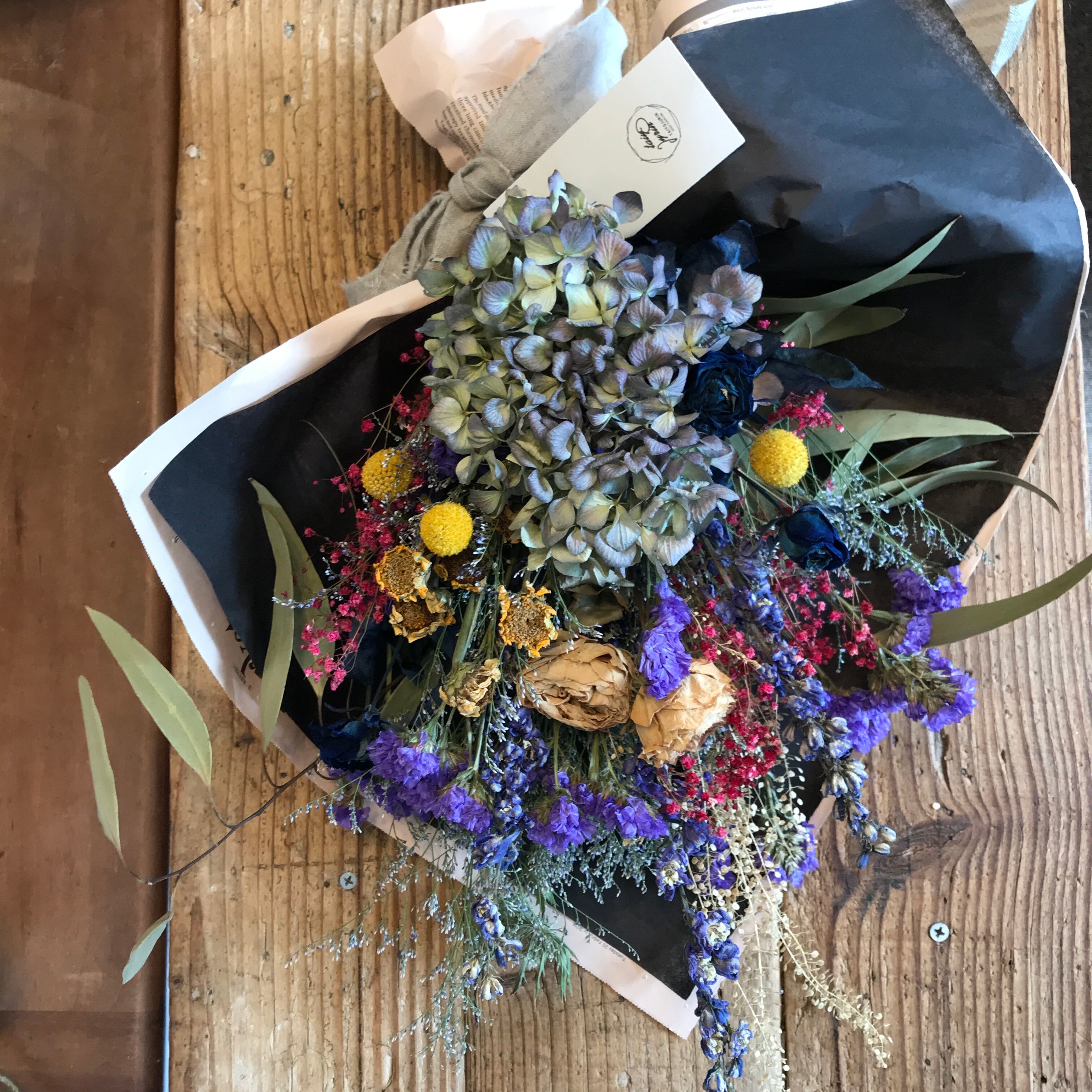 ドライのアジサイと季節のお花を束ねます。 長さ約45センチ