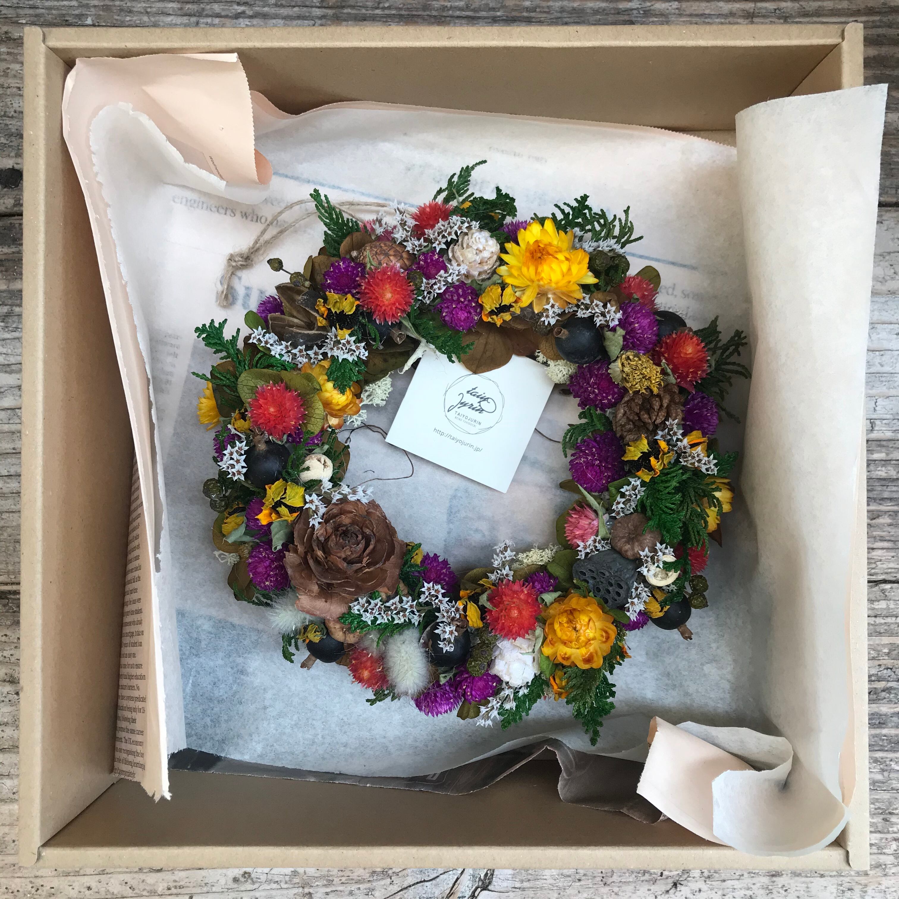 赤やピンクの草花や木の実を合わてお作りします。 箱付きなので贈り物にも。 紙袋をご希望の方は備考欄にお書き下さい。 サイズ 直径約18cm 厚み約6cm 箱サイズ◻︎25×H9cm